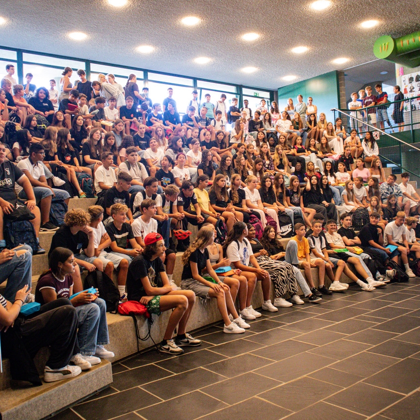 Zum Schuljahresstart versammelten sich 183 Kinder, das Lehrpersonenteam und das Hauswartteam in der Aula, wo Sonnenblumen das Symbol der Feier waren.